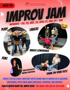 Taught by Michele Partridge (www.yourconfidencecoach.ca) and open to all levels, this monthly improv jam is a chance to play, connect, and laugh together.