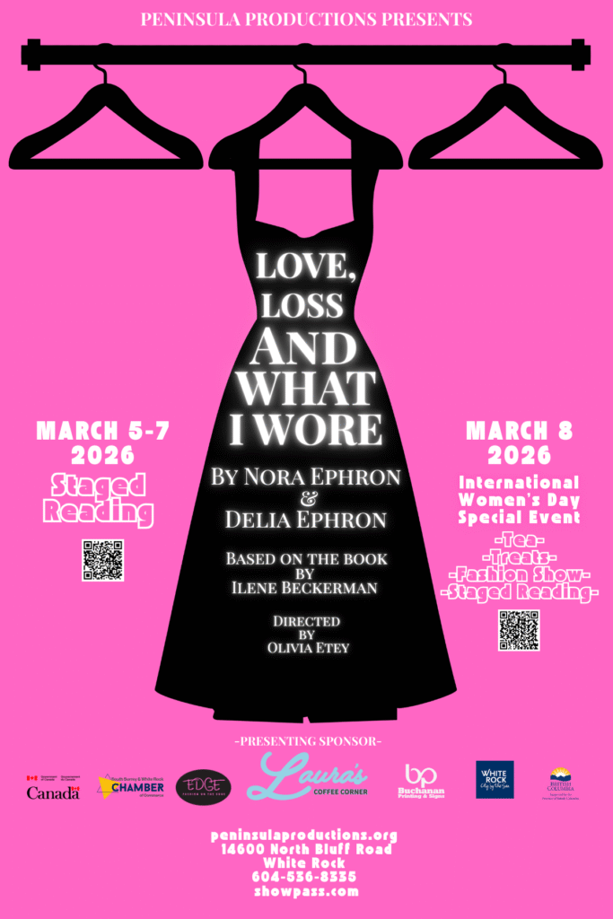 Olivia Etey is a playwright, producer, and the Artistic Director of the Or Festival, a 10 minute play festival in Vancouver that seeks to create a bridge between the Deaf and Hearing Theatre Communities in Canada. (www.orfestival.com) She graduated from UBC with a double major in Creative Writing and English Honours. Her produced plays include: Foreplay (2015), her musical: The Midnight Serenade (2015), Living on the Grid (2016), which debuted at the Vancouver FRINGE Festival as part of The Only Animal’s Generation Hot Series, The Hoarder (2017) and her juke-box Opera Forever Hold Your Peace (Opera Unbound, 2022). Olivia’s play Woman Against Gravity was short-listed for the Lee Playwrighting Award (2024). Her directorial debut was an immersive, theatrical, staged reading of A Day In The Death of Francis Ledwidge by Irish playwright Richard Ball at the Wolf & Hound Pub in Vancouver. Olivia is deeply grateful to Jan and Janet at Peninsula Productions for bringing her onboard and to the fabulous cast and team of Love, Loss, And What I Wore by Nora Ephron and Delia Ephron. Love you all!